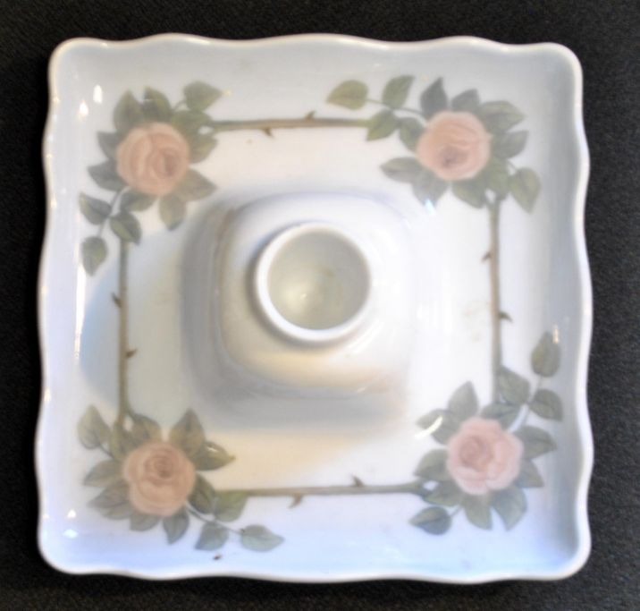 Royal Copenhagen porcelain inkwell, 1127/258, 20th century Copenhagen, Denmark. White porcelain with light blue overpaints and roses. Wavy edge. Height: 4.6 cm. 15 x 15 cm.