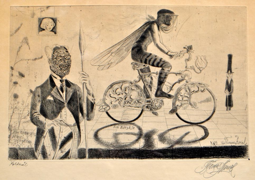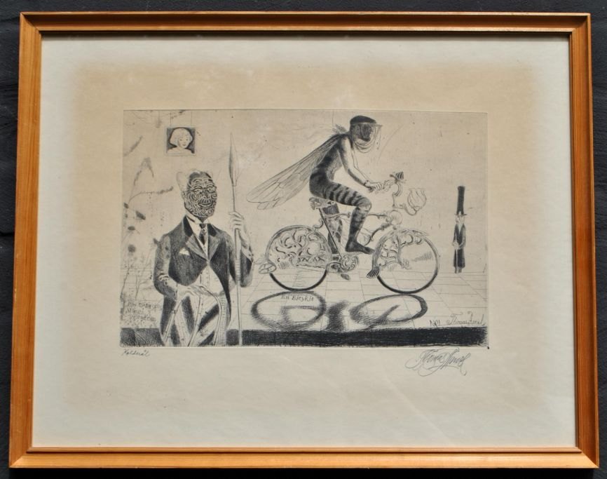 Arnel, Thomas (1922 - 2010) Denmark: A tattooed Maori delegate/A bicycle. Cold needle. Signed: Thomas Arnel 1961. H: 21 cm. W: 33 cm. Framed: H: 41 cm. W: 52 cm.Item number: 26596