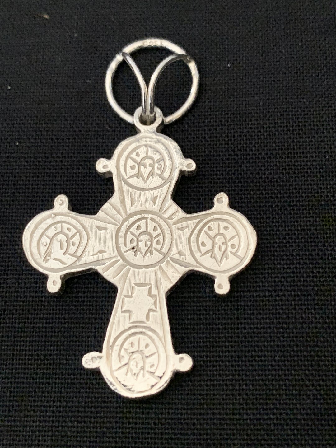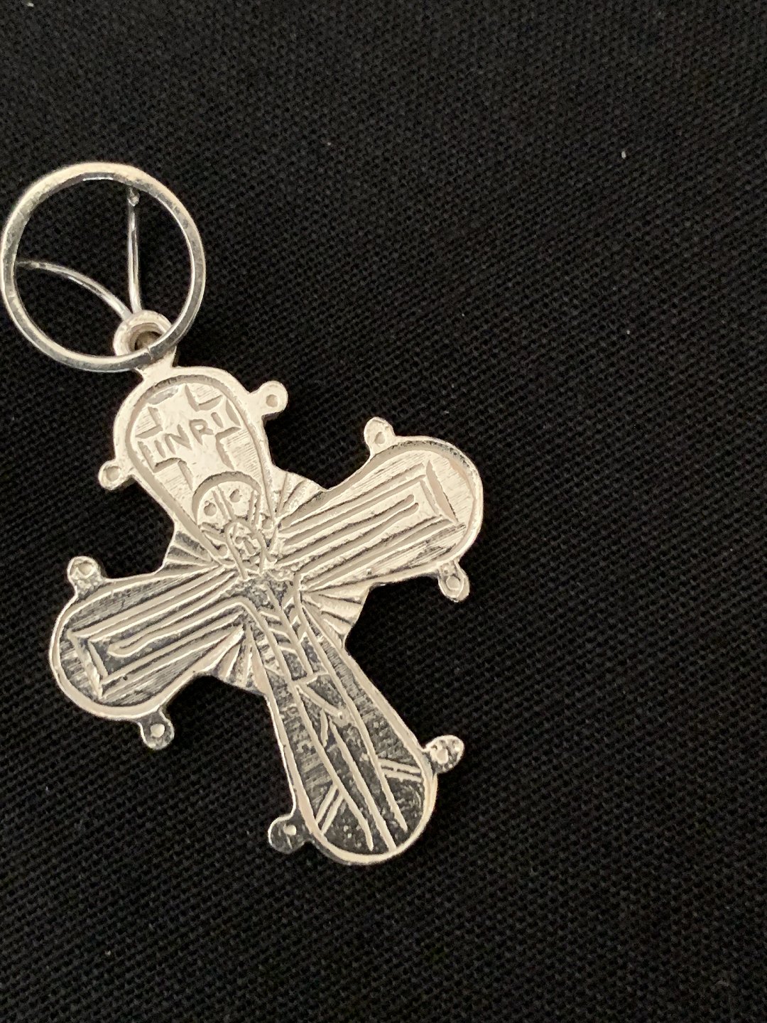 Beautiful Daymark cross in solid 925 sterling silver, and with nice details. These details give the pendant identity and make it completely unique. On the front is the suffering Jesus on the cross and on the back there are five circles that symbolize religious figures in Christianity.Due to the large ring, this pendant can be combined with a solid silver chain.