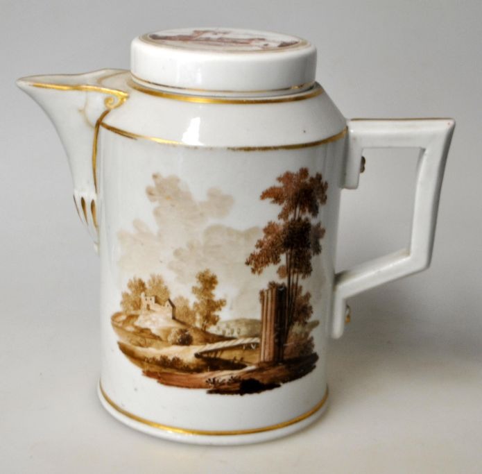 Antique German coffee pot approx. 1840. J.G. W Greiner's Widow and Greiner's Widow & Leers. Hand-painted brownish decorations with castles on the side and on the lid. With gilding. Stamped. Height.: 14 cm.NB: Microscopic crack at spout. Otherwise perfect condition!