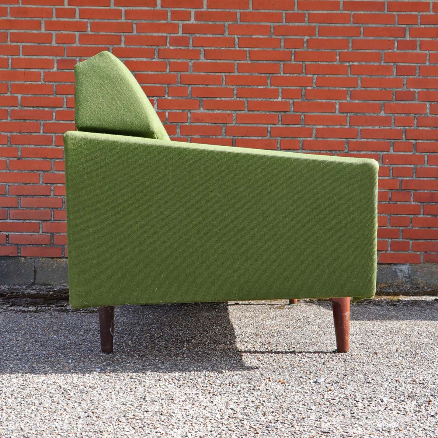 Tre personers sovesofa betrukket med grønt uldstof og stel i teaktræ. Sofaen har en smart funktion, hvor metalbenene til sovesofaens udtræksdel er fastmonteret og bliver skjult i træstellet, når den ikke er slået ud.Producent ukendt