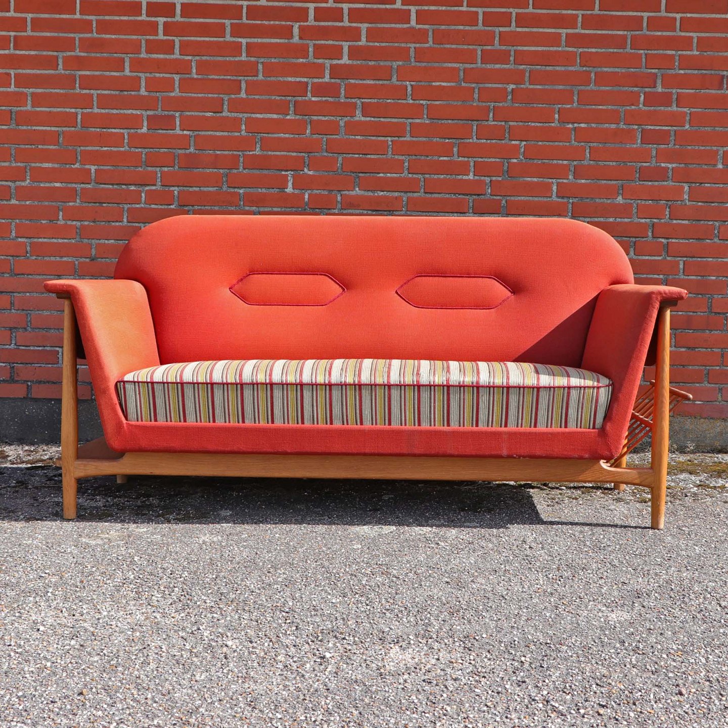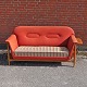 Retro to personers sofa med stel i lakeret teaktræ samt avisholder og afsætningsplade. I hver ende har sofaen en bordplade, som kan slået op. Den har sæde af springfjeder, hvor ryg og bagside er betrukket med slidstærkt rustrød uldbetræk. Sædet er betrukket med slidstærkt struktureret stof med lyse, gul og rustrøde striber.Producent ukendt