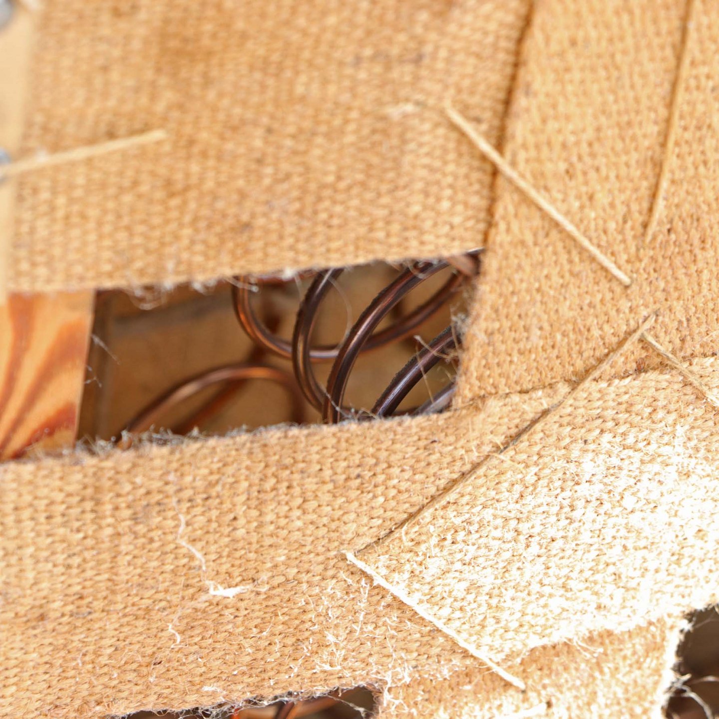 Fremstår med brugsspor og vandmærker på træstel samt slid og enkelt hul på stofbetræk. Trænger til en ompolstring.