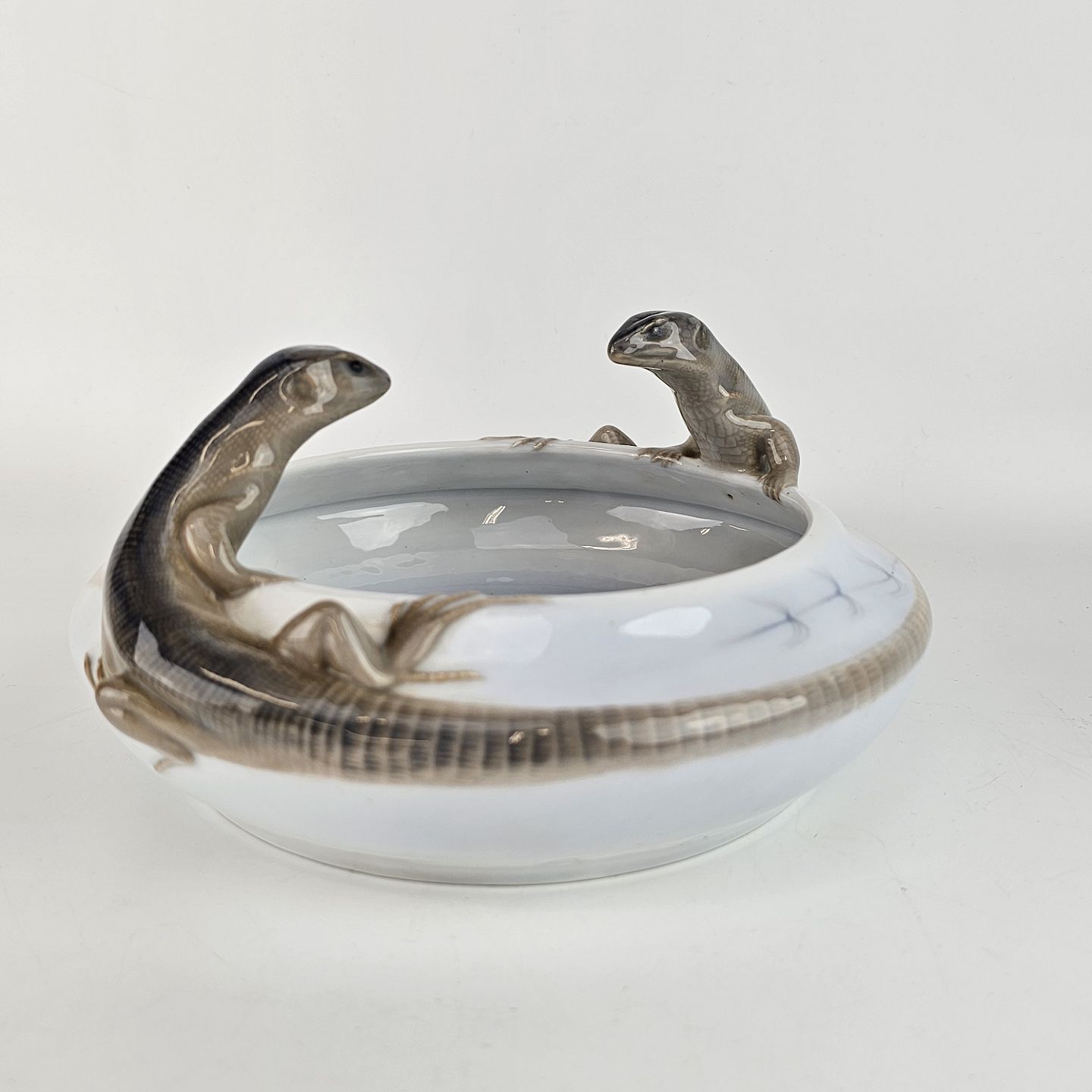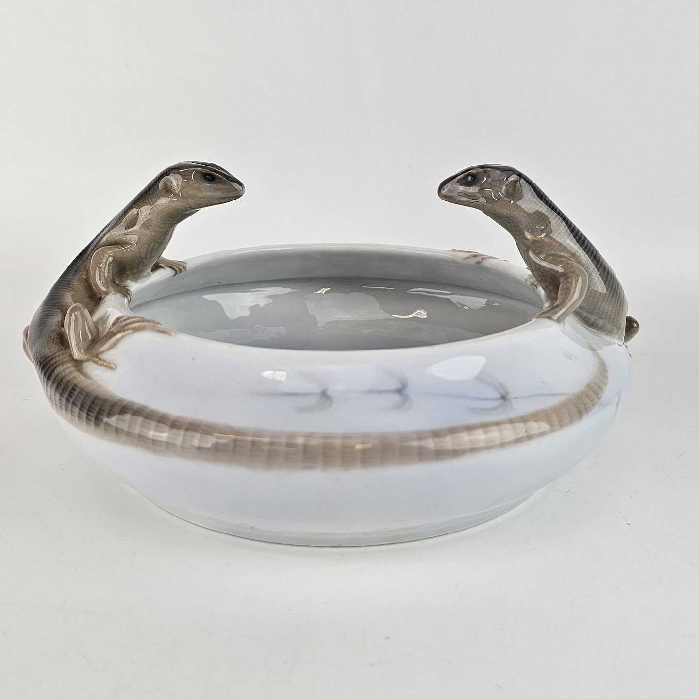 Skål af porcelæn med høje kanter, dekoreret med 2 firben hvis haler ligger langs kanten. Nede i skålen er der malet en blomst. Nr. 397/26