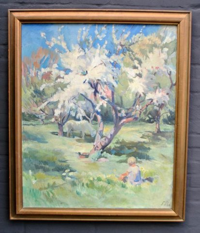 Paulsen, Sophus Peder Lassen (1883 - 1935) Danmark: Et barn og en hest under blomstrende træer. Olie på lærred. Signeret: Monogram 1930. 91 x 76 cm.Indrammet: 105 x 88 cm.