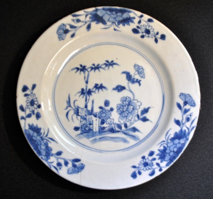 Chinese blue painted plate, 18th century Chien Lung. Hand painted decorations with flowers. Diameter: 23 cm. Unstamped.NB: With hairline cracks and small chips along the edge.