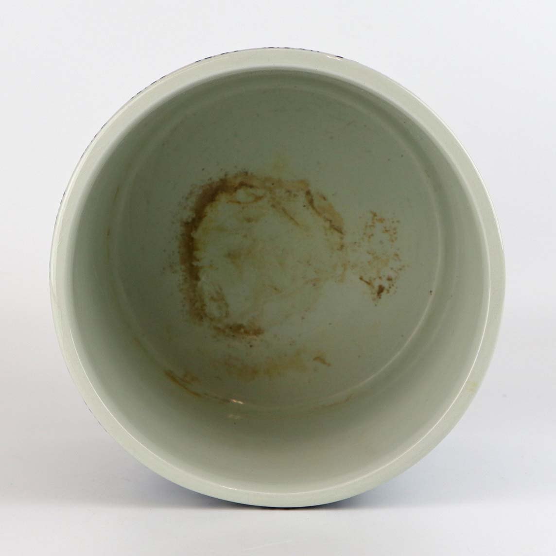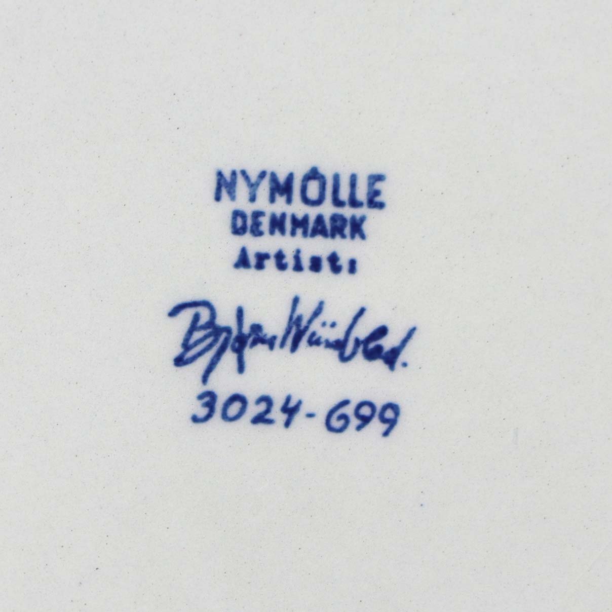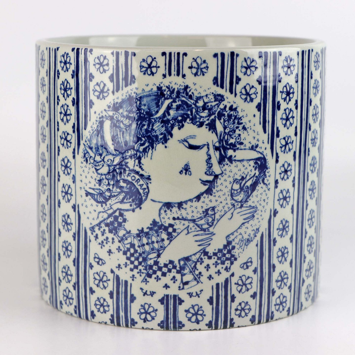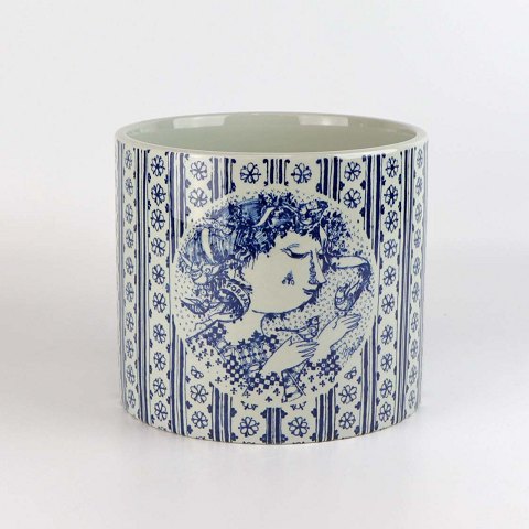 Urtepotteskjuler i porcelæn med motiv i blå streg af kvinde med fugl på hånd med titlen Foraar. Nr. 3024-699Formgiver Bjørn Wiinblad