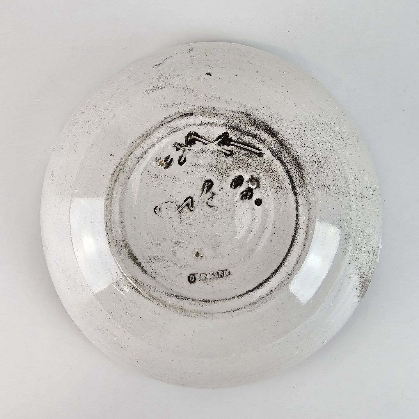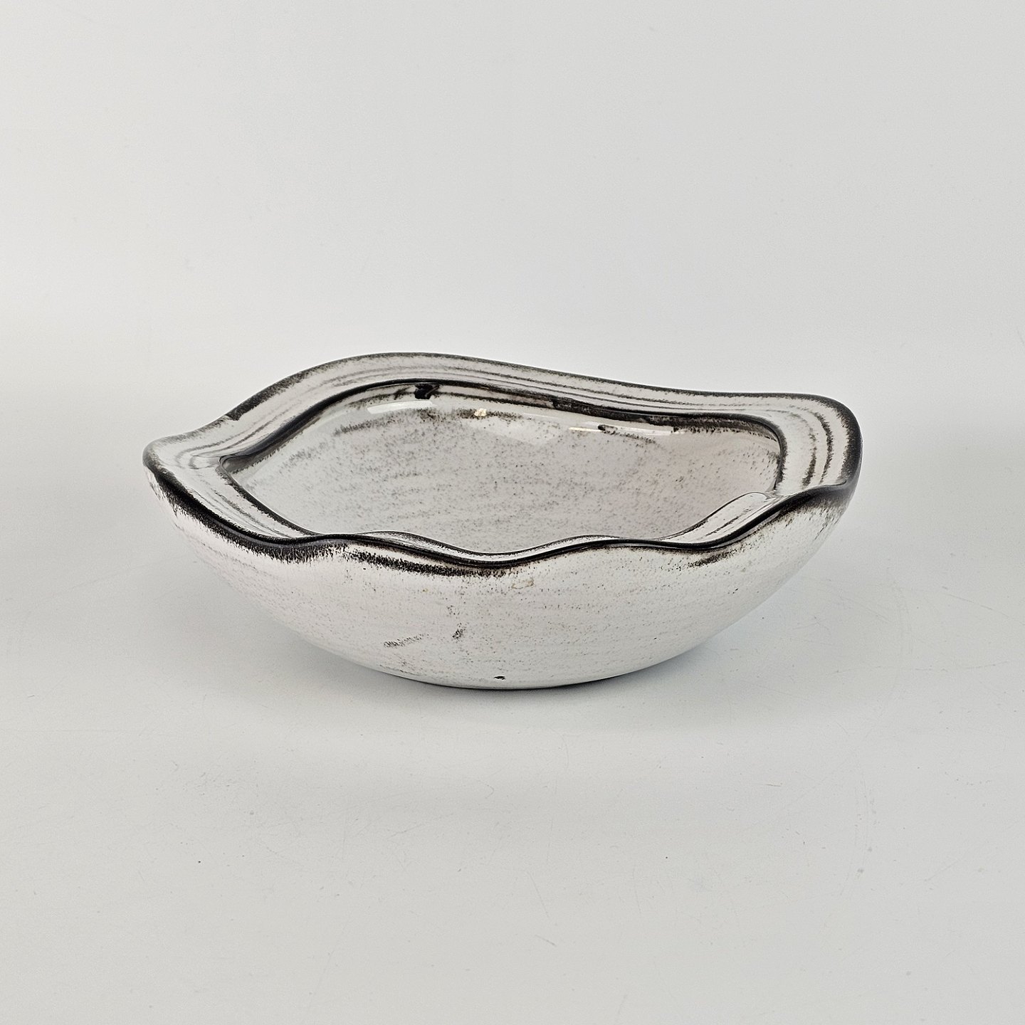Skål af hvid glaseret keramik med sorte streger og nister