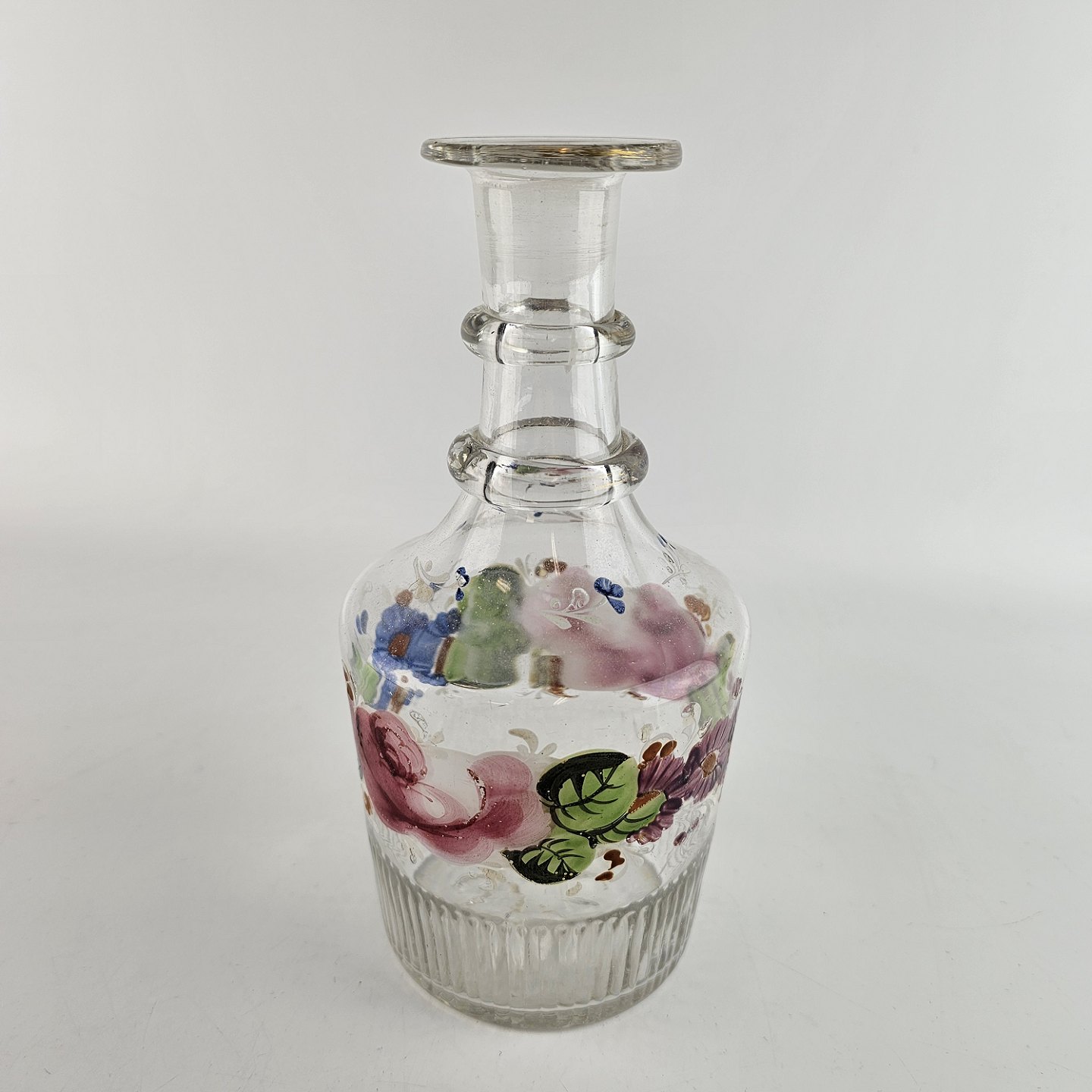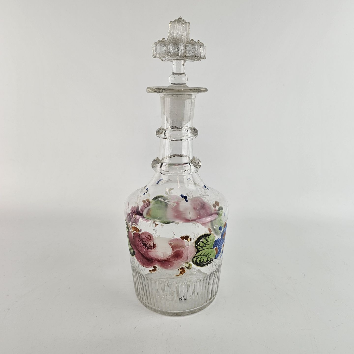 Mundblæst karaffel af glas, dekoreret med emaljemalede frise indeholdende roser, blade og forskellige blomster. Revne i nederste del. Måske Nordtysk fra ca 1850