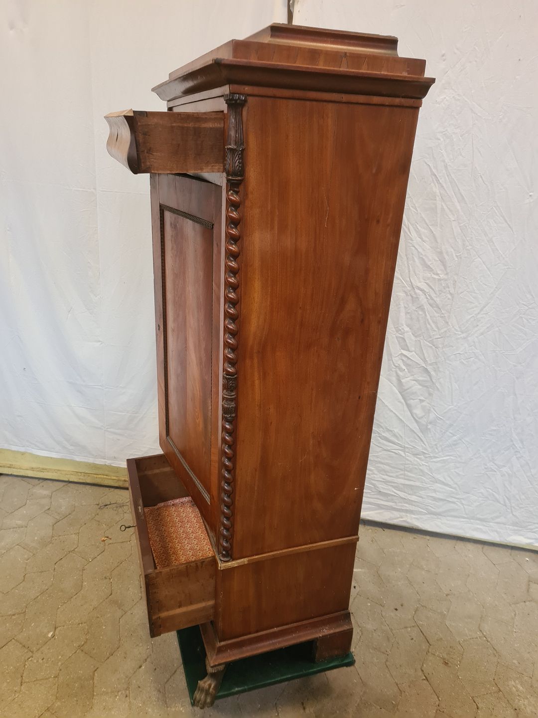 Skab i fineret mahogni, fra 1890erne.Det har brugsspor og finer defekter.
