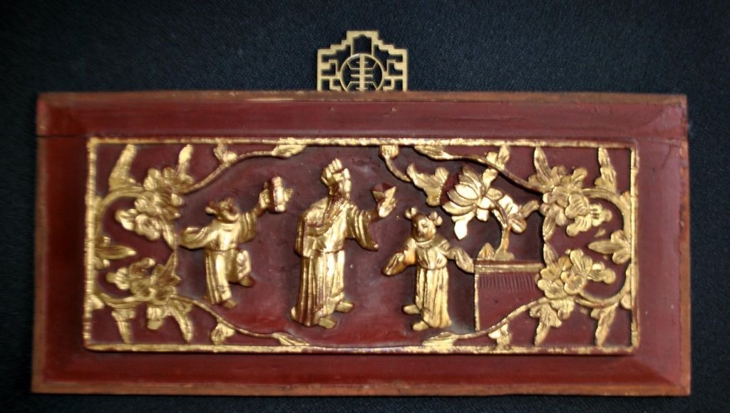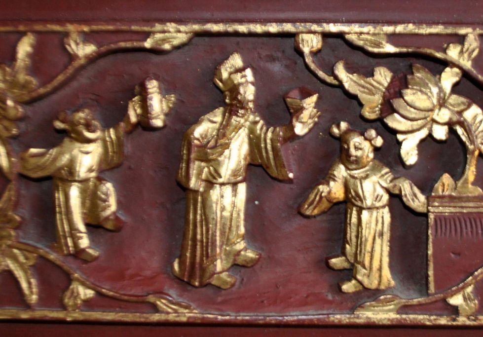 Red-painted Chinese woodcut with gilding, 19th century Carvings in the form of a sage and two children in a garden. With brass suspension. 16.5 x 36 cm.Perfect condition!