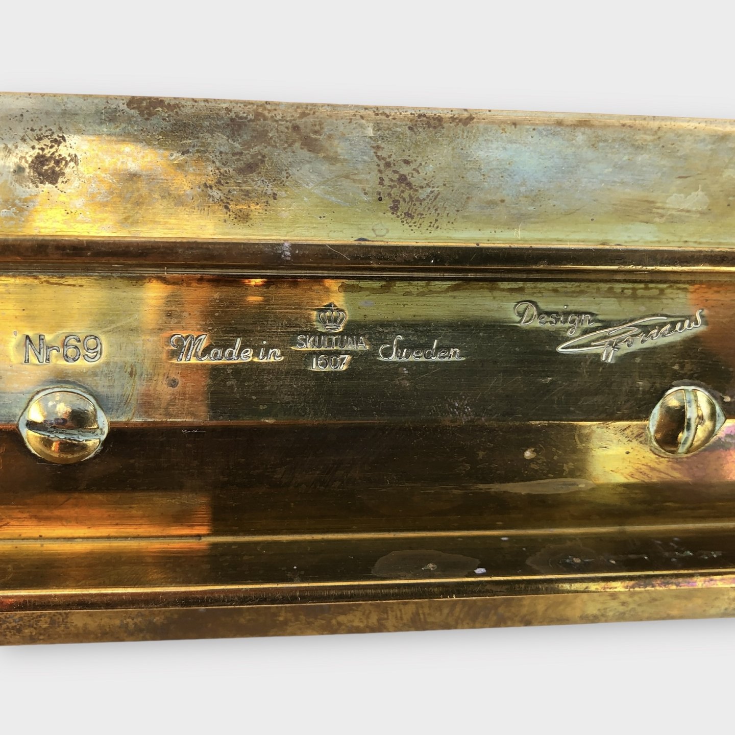 Skultuna 1607, Sweden, Massive Brass candlesticks for 4 candles, No. 69, design: Pierre Forsell, appears patinated/unpolished, length 34.5 cmStock: 1
