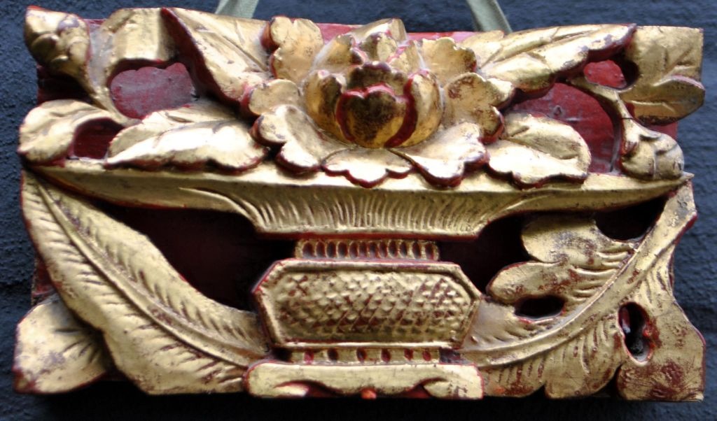 Small red-painted Chinese woodcut with gilding, 19th century. Cuts in the form of foliage and a rose in a vase. 7.5 x 13.5 cm.Perfect condition!