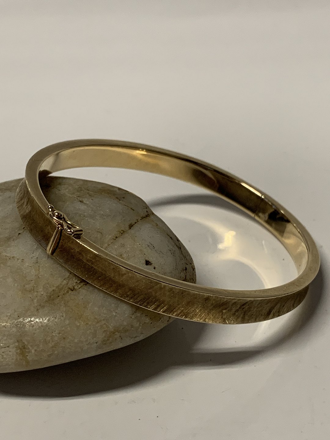 Vintagearmring i 14 karat guld med ceseleringer.Den ovale armring åbnes/lukkes ved indstikslåsen på siden og der er en ekstra sikkerhedslås i form af et 8tal.