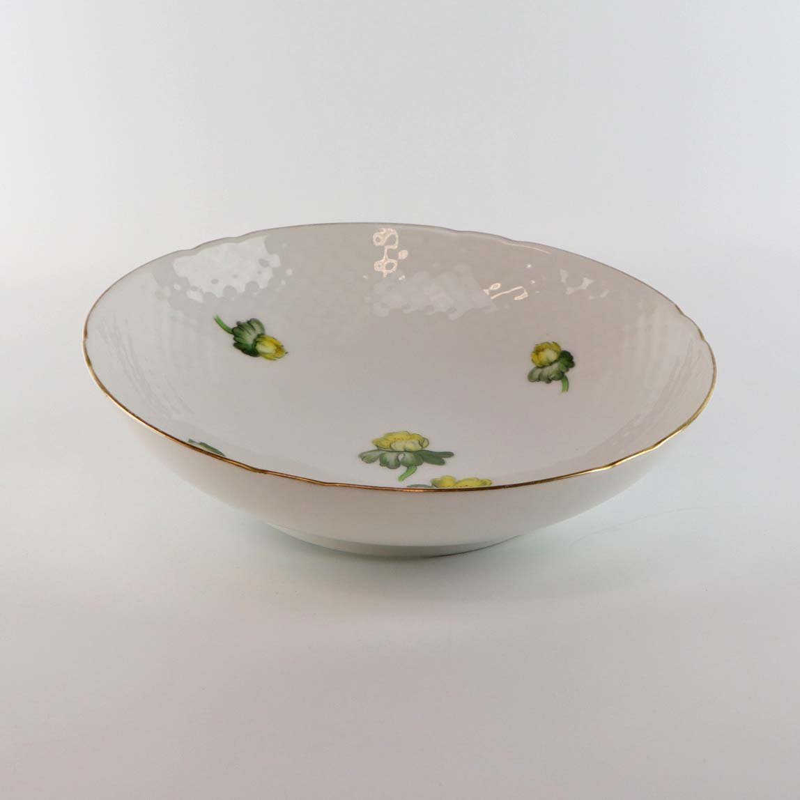 Hvidt porcelæn i skælform med dekoration af gule blomster og guldkant