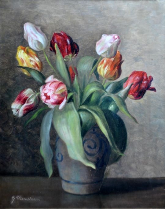 Vermehren, Yelva (1878 - 1980) Danmark: Opstilling med tulipaner i en krukke. Olie på lærred. Signeret. 46 x 38 cm.Indrammet: 62 x 54 cm.