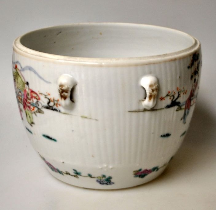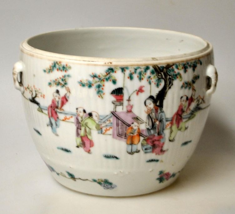 Kinesisk porcelæns skål uden låg med to hanke, 19. årh. Famille rose. Håndbemalede polykrome dekorationer med kvinder i optog og kvinder i leg med børn. Ustemplet. H.: 12 cm. Dia.: 16 cm.Emne nummer: 27086