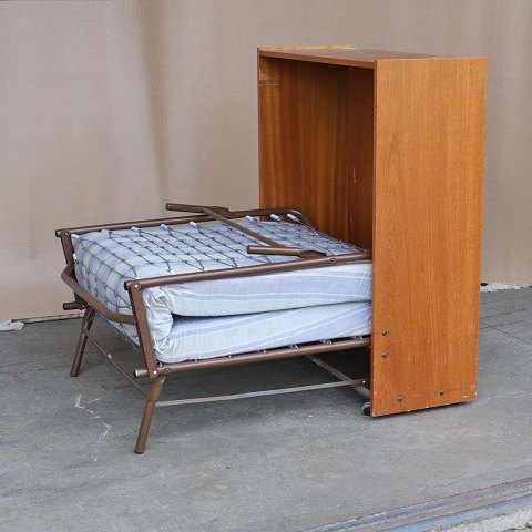 Ældre skab i lakeret teaktræ med monteret fold-ud seng i metal samt madras. Skabssengen er udstyret med hjul, så den let kan flyttes rundt.Producent ukendt