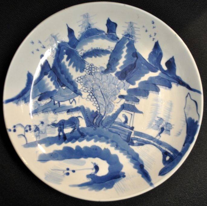 Kinesisk blå/hvid malet porcelæns fad, 19. årh. Dekoration af huse i landskab. Signeret. Dia: 25 cm.Emne nummer: 27010
