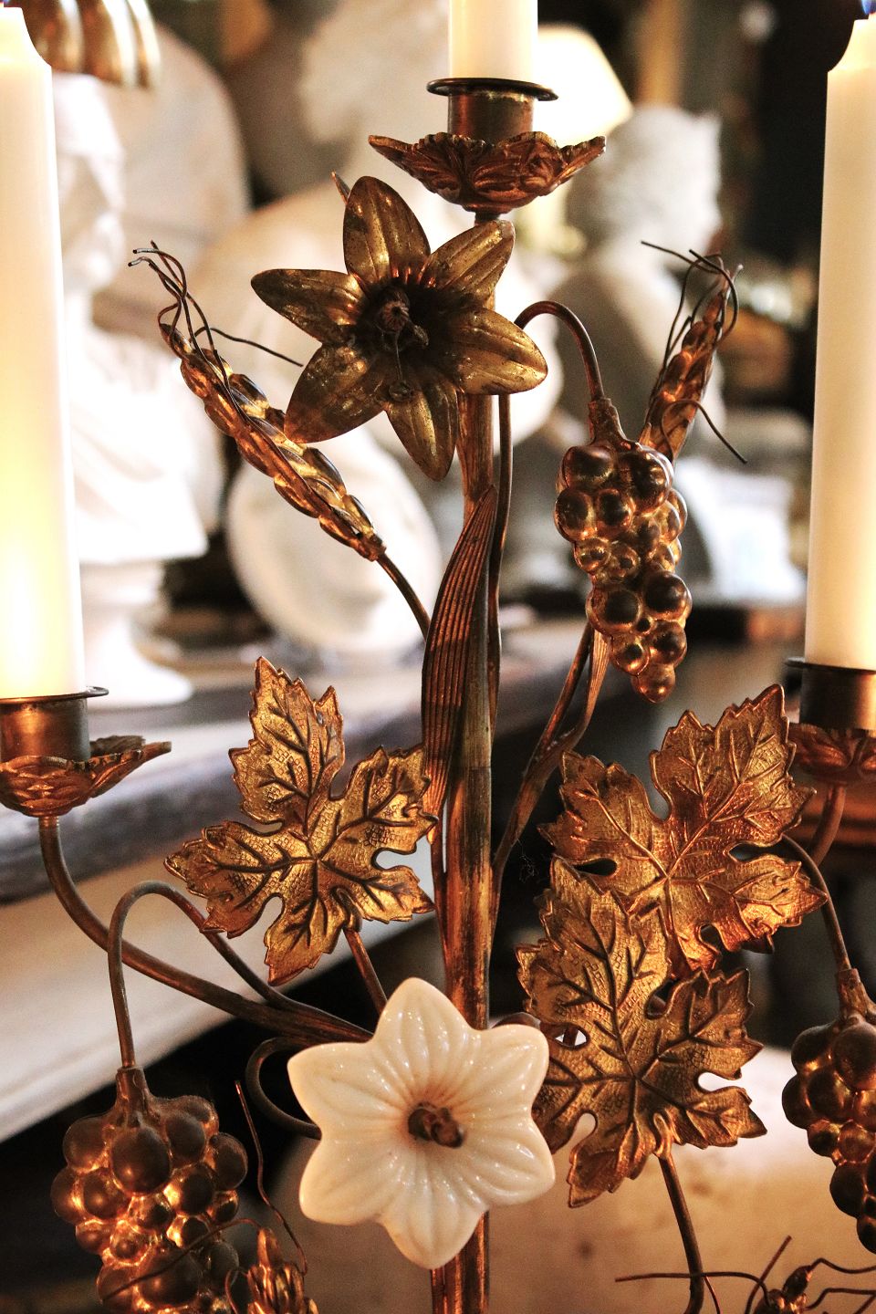 Large antique, decorative French church candlestick / thanksgiving candlestick in bronze with space for 7 candles from the 19th century.The candlestick is decorated with lots of bunches of grapes, corn, wine leaves, bronze flowers and 3 rare large white opal glass flowers, as well as a really nice foot. A really beautiful candlestick. H: 101cm. W: 36cm.