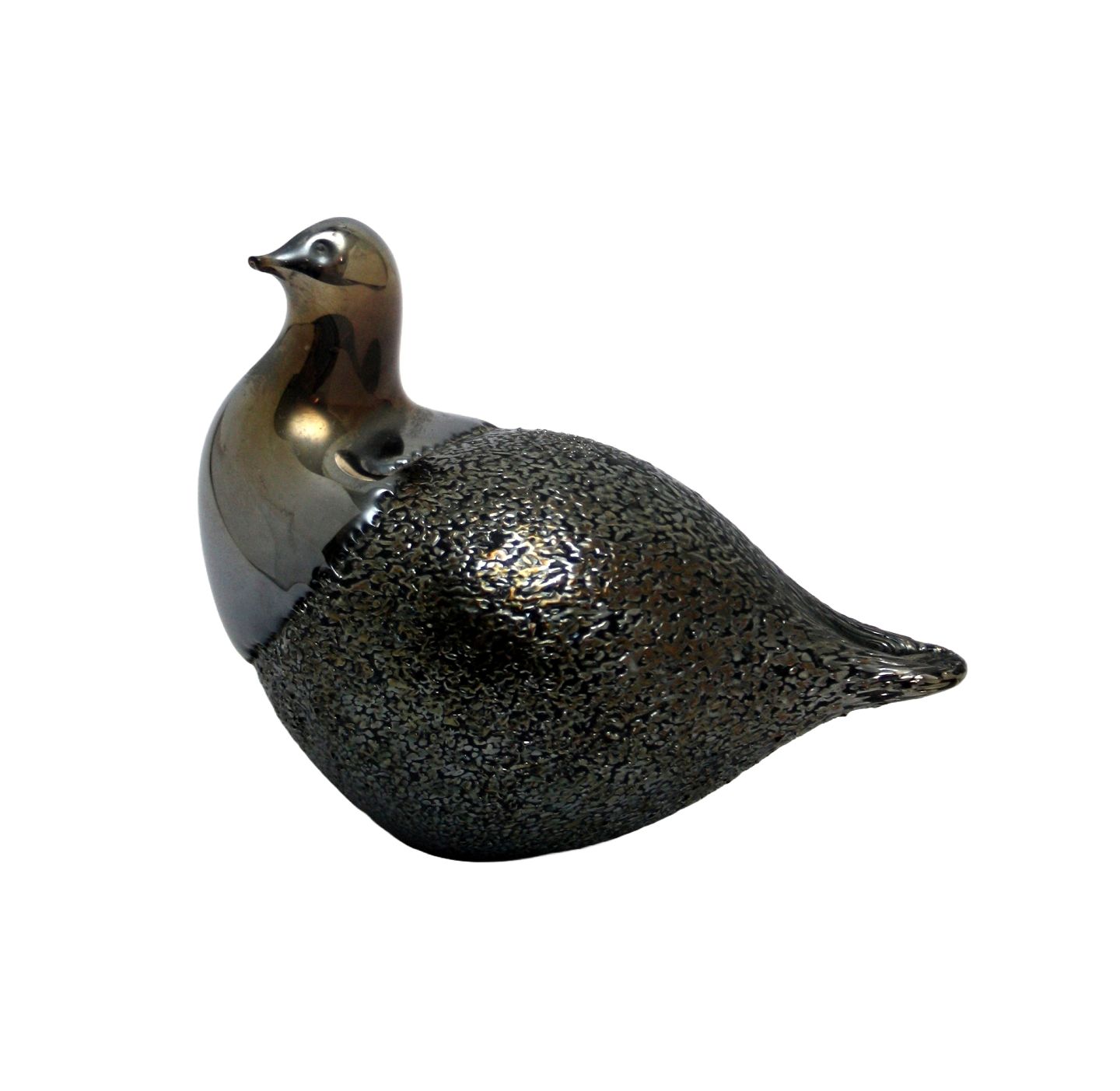 Fugl i sort og sølv designet af Jussi Riihimäki, Finland. Højde 10 cm. Længde 13 cm. Materialet er glas med en tung metallegering udenpå. Pris: 450 kr. Udstiller