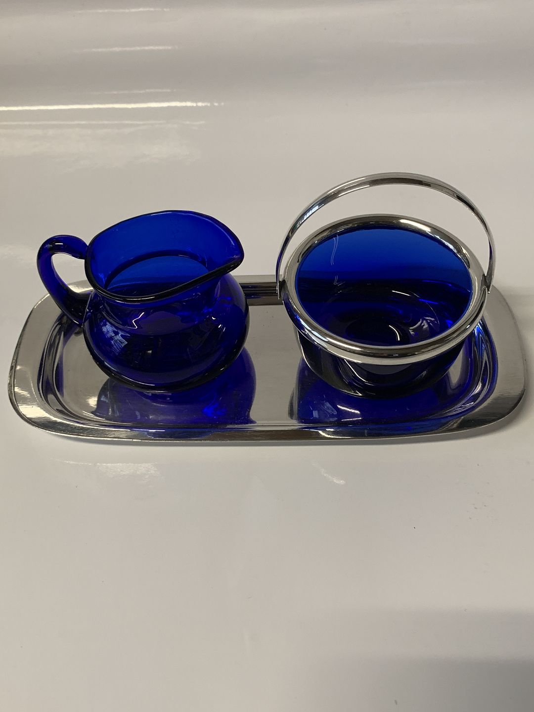 Lille sukkerskål og flødekande i blåt glas, med en sølvplet bakke. Sukkerkummen med hank af sølvplet, som er stemplet. Et flot sæt, der vil passe til både morgen- og kaffebordet.Højde på selve sukkerskålen 4,5 centimeter.