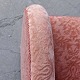 Ældre lænestol med stel i mørk lakeret træ. Stolen er betrukket med rosafarvet struktureret stof og har sæde med springfjederProducent ukendt
