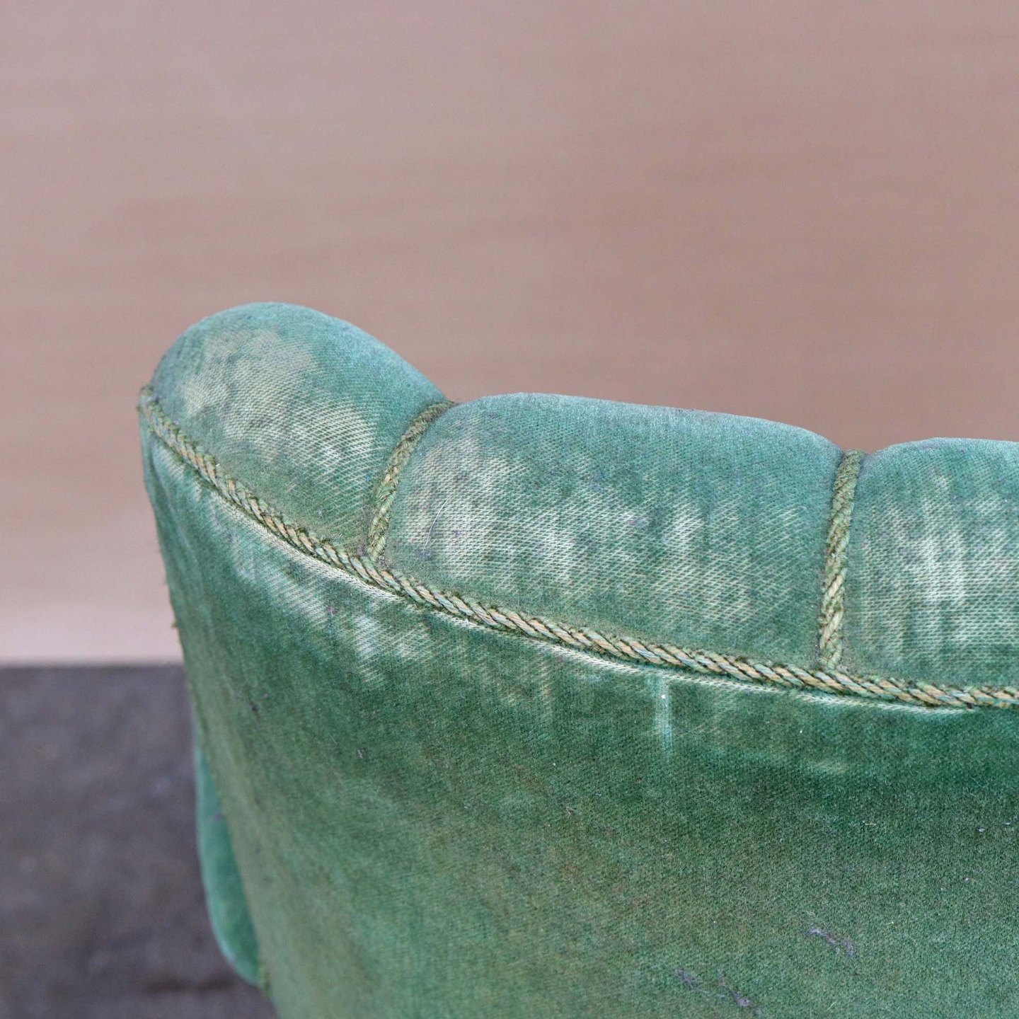 Ældre polstret lænestol med stel i mørk lakeret træ. Stolen er betrukket med grøn velourstof og har sæde med springfjederProducent ukendt