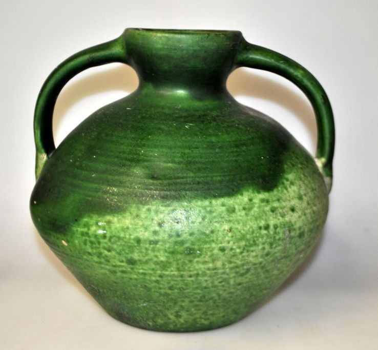 Nielsen, Christian (19./20. årh.) Danmark: Vase med to hanke. Grøn glaseret. Signeret. H.: 23 cm. Dia.: 23 cm.Emne nummer: 27074