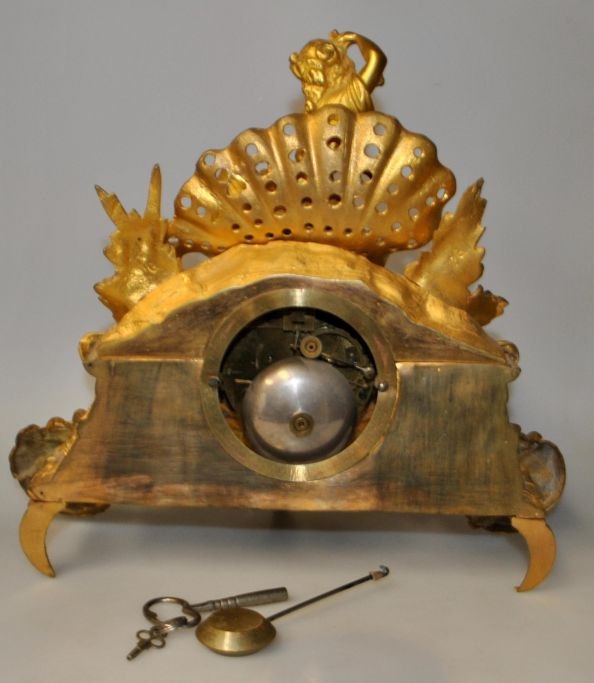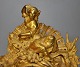 Fransk lueforgyldt bronze kaminur, 19. årh. Urhus dekoreret med blomster og blade. Topfigur i form af kvinde. Emaljeret skive med romertal. Optrækkelig. Nøgle og pendul medfølger. H: 29 cm. B.: 33 cm.NB: Skiven med revner.