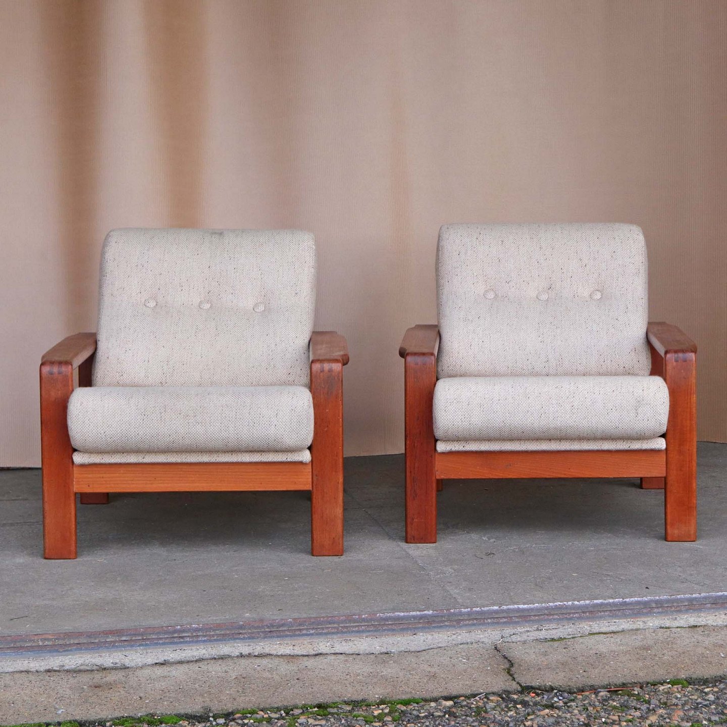 Et sæt lænestole med stel i lakeret teaktræ og hynder betrukket med lyst uldstof.Producent ECM
