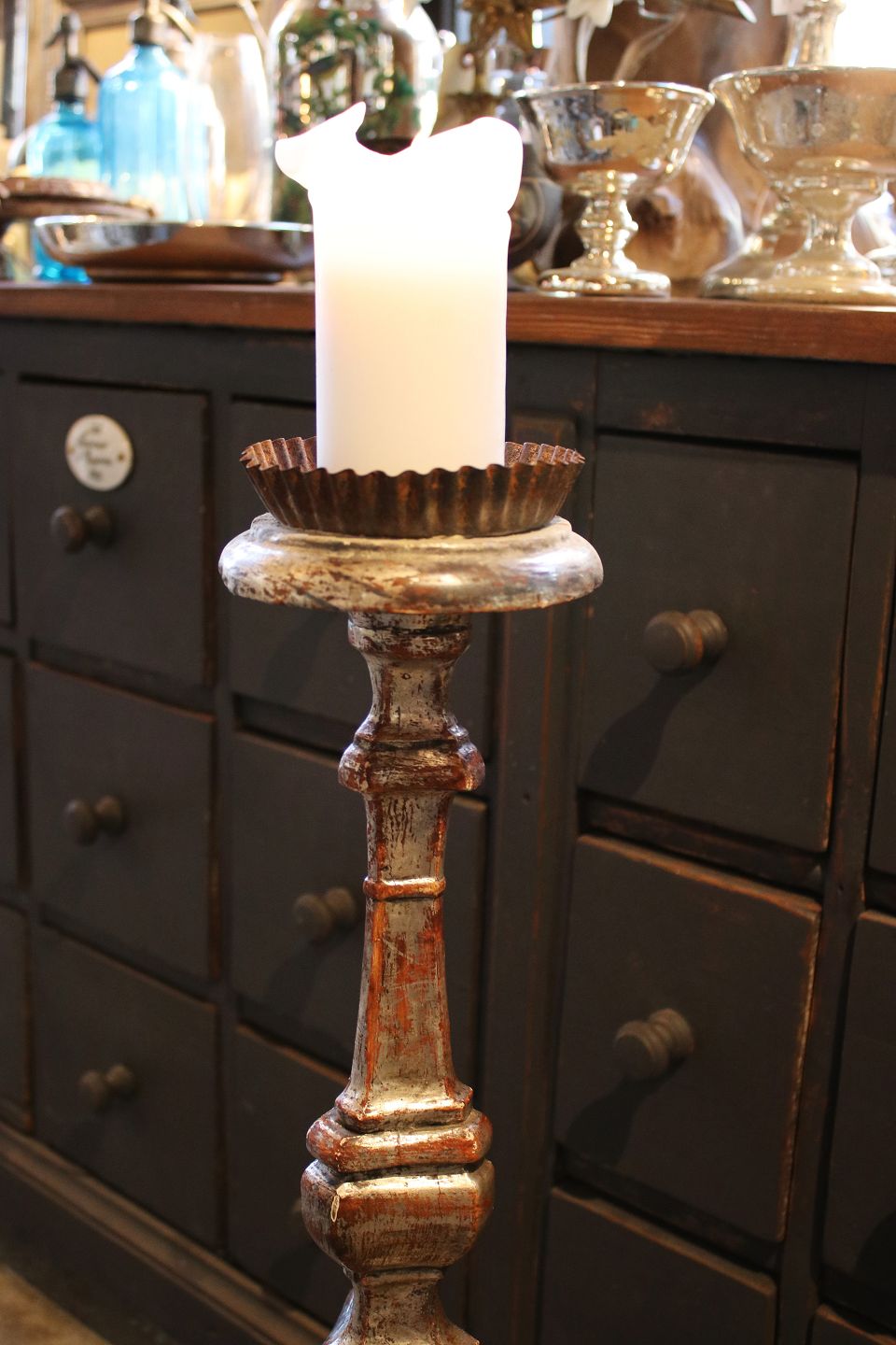 Antik , fransk gulv lysestage i udskåret træ med gammel sølvbelægning og en rigtig fin patina.Lysestagen har stået i en gammel fransk kirke , har plads til et stort bloklys og er 89 cm. høj.