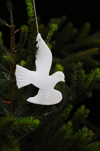 juletræspynt i form af lille fredsdue i perlemors hvid plast fra 50érne. Længde 8,5cm. ( 4 stk. haves.)Emne nummer: Jul nr. 581