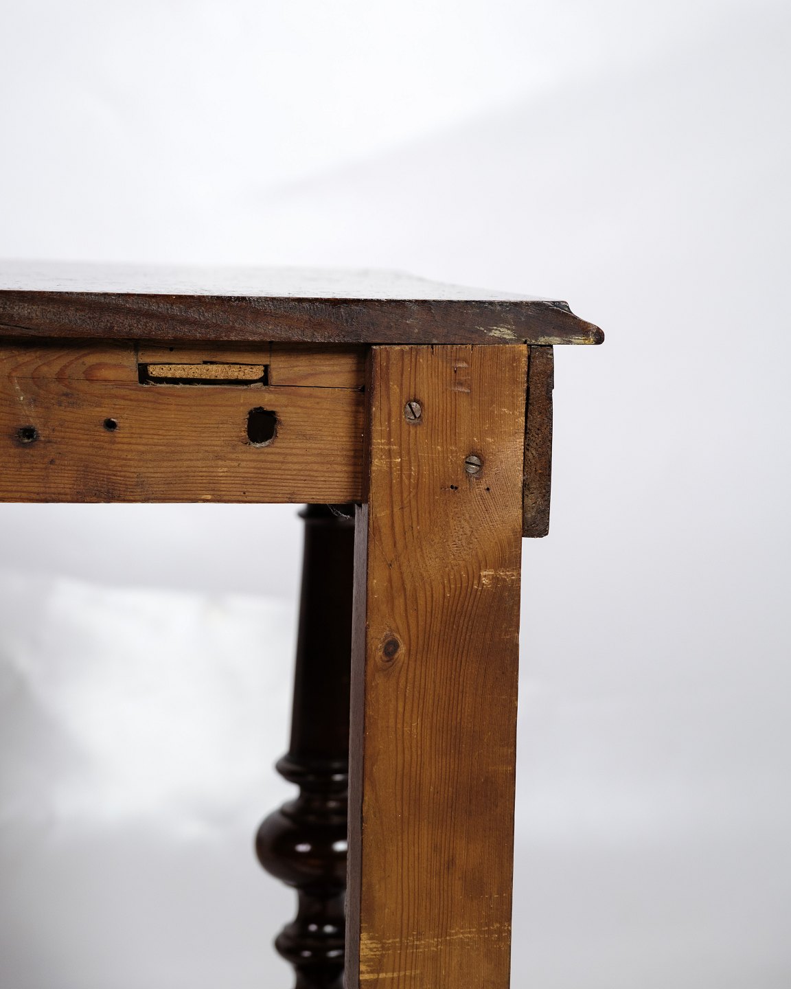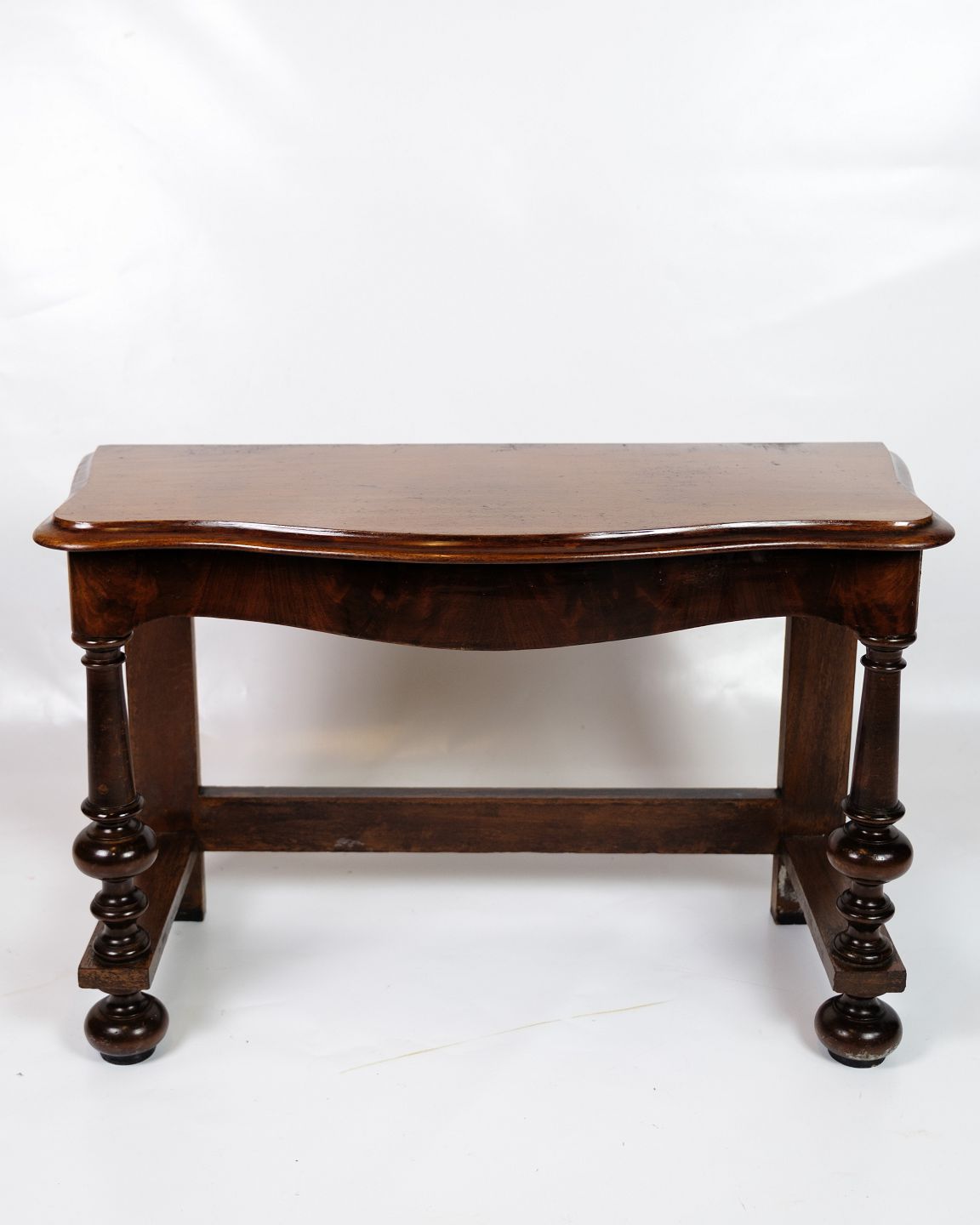 Console table or hall table from the 1920s, made of mahogany with round, elegantly turned legs. The table's slim design makes it ideal as a functional piece of furniture in the hall or as a console table in the living room. The warm color of the mahogany and its fine grain pattern reflect the period and craftsmanship typical of 1920s furniture production.Dimensions: H:49cm W:75cm D:30cm