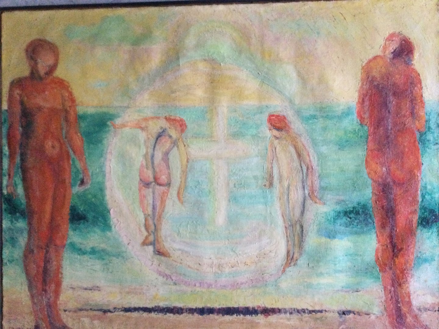 Leif Dreier Gaihede (1926-69):Komposition med Nøgen mennesker på stranden og et Kors.