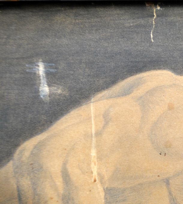 Danish artist (19th century): Nude study. Drawing. Charcoal and pencil on paper. Indistinctly signed and dated 29-3-87. H: 89 cm. W: 44 cm.Framed: H: 99 cm. W: 53 cm.