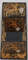 Avisholder i træ med vikinge ornamentik med drager og grif. Lakarbejde i sort, grønt og rødt på birketræ. Dateret til 1898, i forbindelse med et 25 års jubilæum - måske et sølvbryllup? Med to hylder. Med monogram. H.: 63 cm. B.: 28 cm.Antagelig Norsk arbejde!