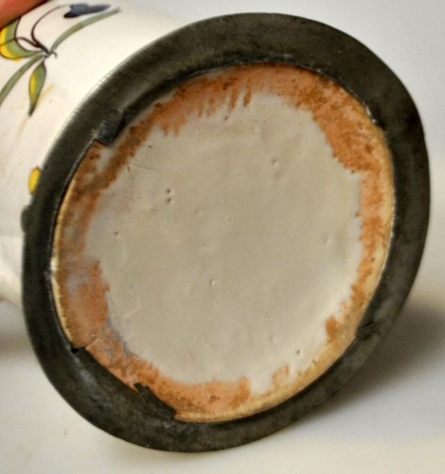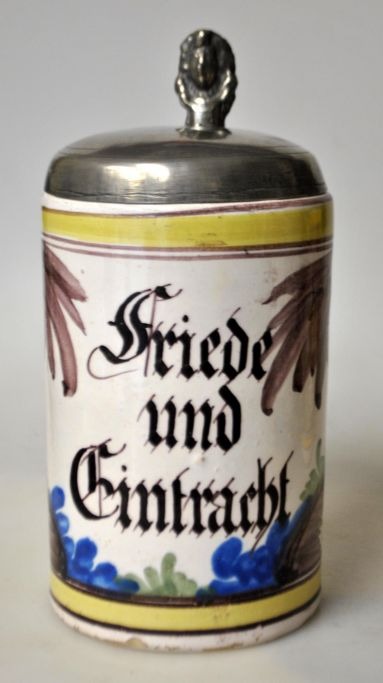 Beer mug, faience, Hannoversch Münden, ca. 1830, Germany. Polychrome decoration with German text: "Friede und Eintracht". Signed at the bottom. Pewter lid with lion. Stamped. With handle. H.: 19 cm.NB: Perfect condition!