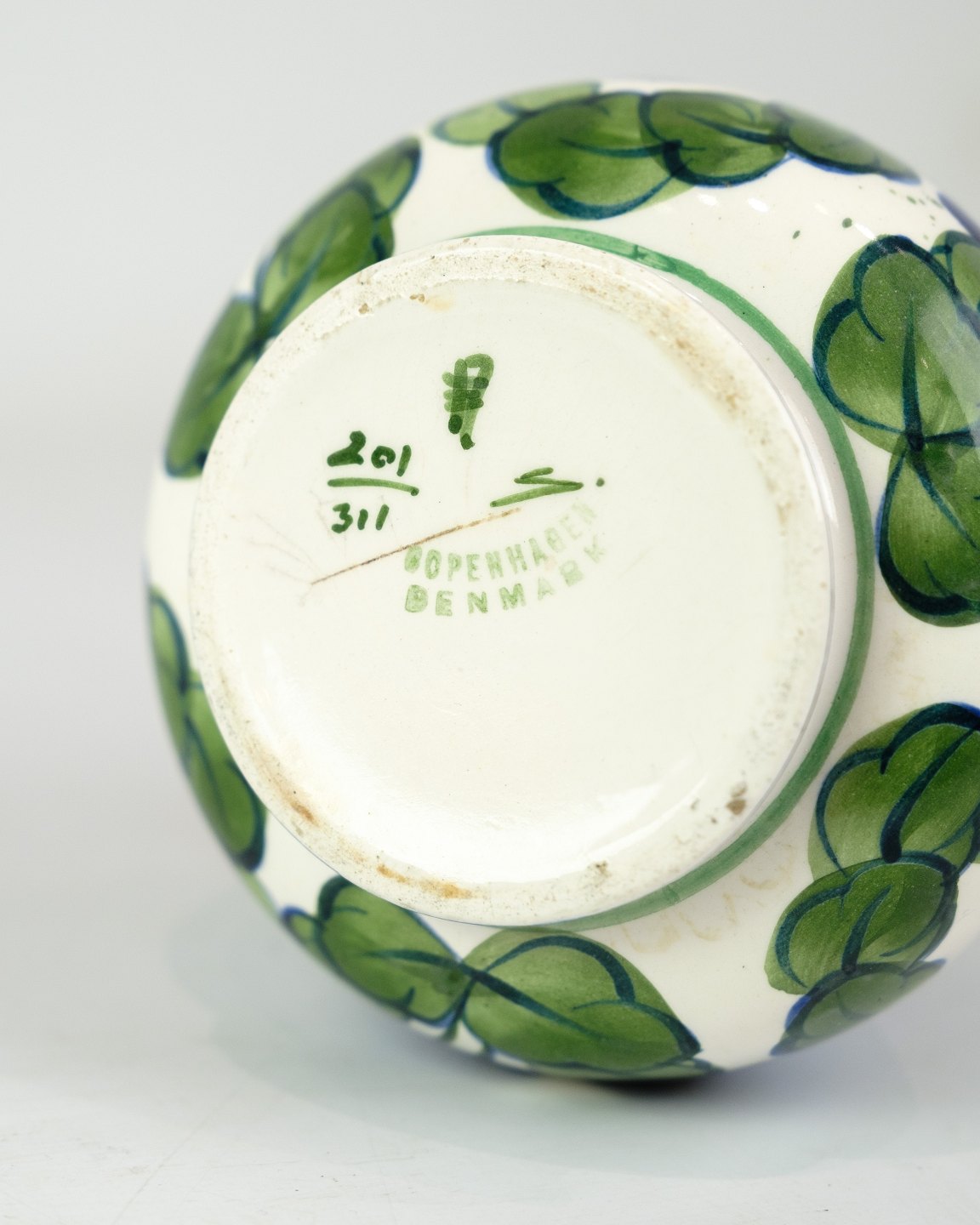 Denne vase, model 201/311, er fremstillet i fajance og dekoreret med et elegant, håndmalet klematismotiv. De fine detaljer og den kunstneriske udsmykning gør vasen til en unik og tidløs dekoration, der passer ind i både klassiske og moderne omgivelser.Aluminia var en dansk fajancefabrik, grundlagt i 1863 og senere en del af Royal Copenhagen i 1948. Fabrikken var kendt for sine håndmalede motiver og dekorative designs, som i dag er eftertragtede blandt samlere.