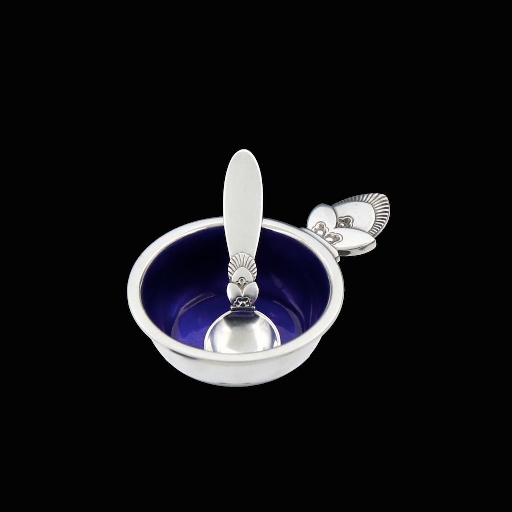 Georg Jensen. Sterling Silver Salt Cellar #102 with Enamel and Spoon 103 - Cactus.Designed by Gundorph Albertus (1887-1970) in 1930.