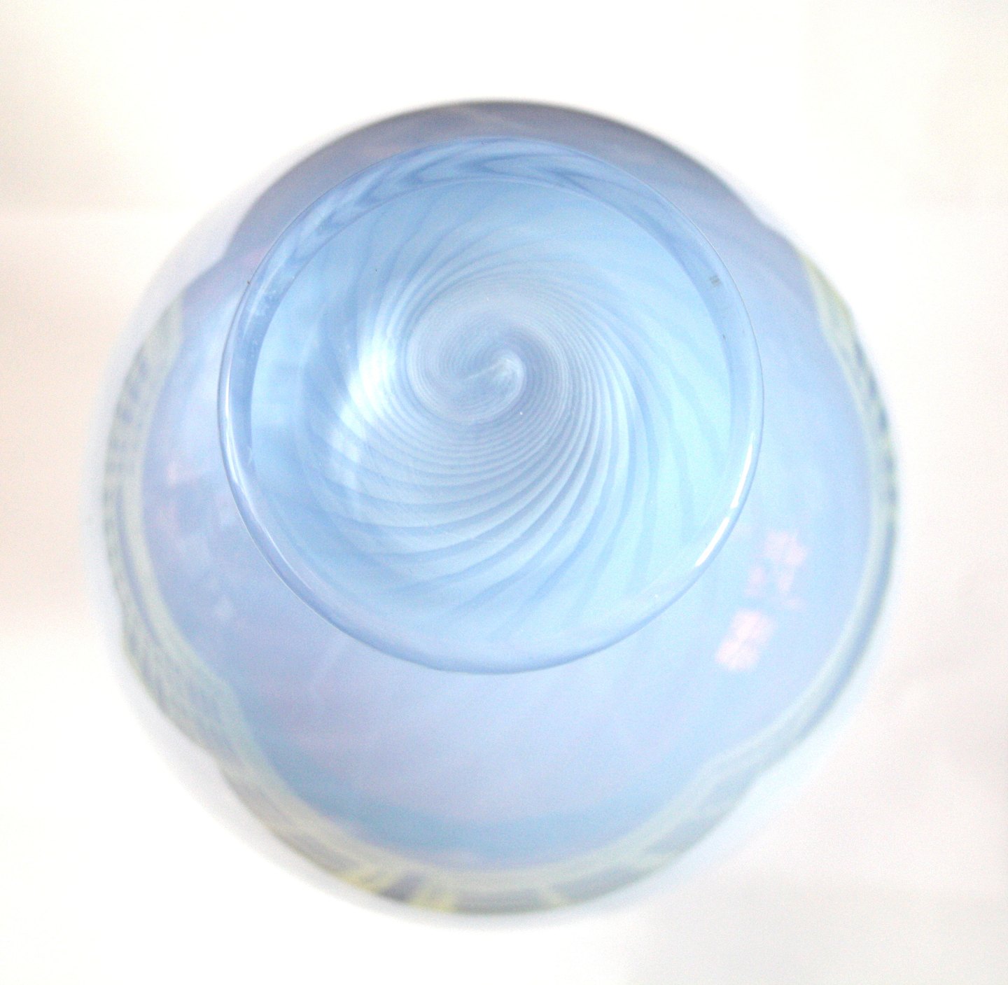 Holmegaard, Spring serie i transparent isblå med skrå striber med klar fod. Designet af Michael Bang i 2003. Serien er ikke signeret.Vase. Højde 20,5 cm. Diameter 14 cm. Lettere brugsslid i form af enkelte ridser ellers fin stand. Pris: 300 kr. stk. Lager: 1