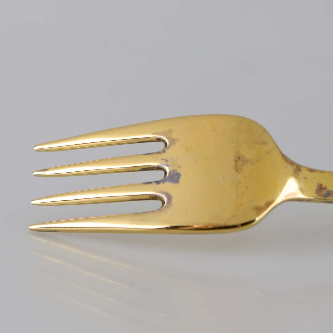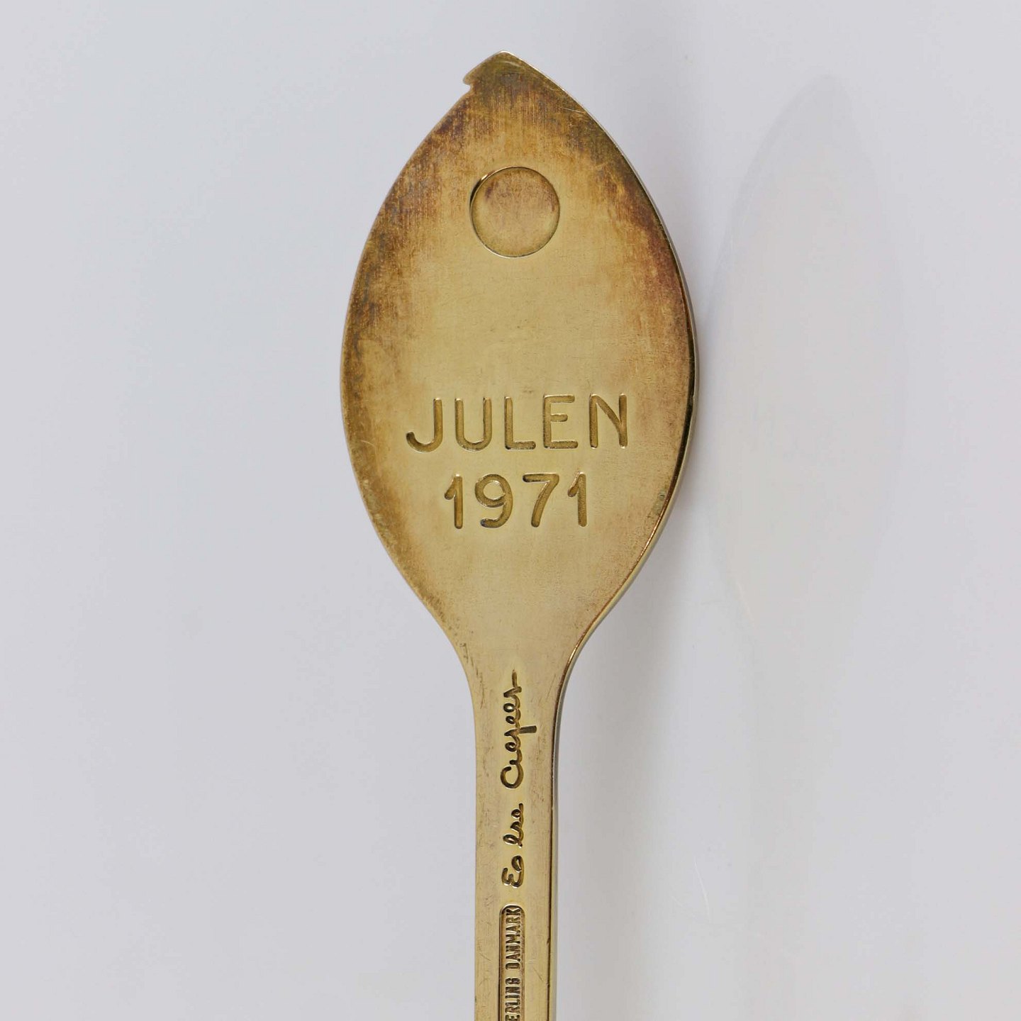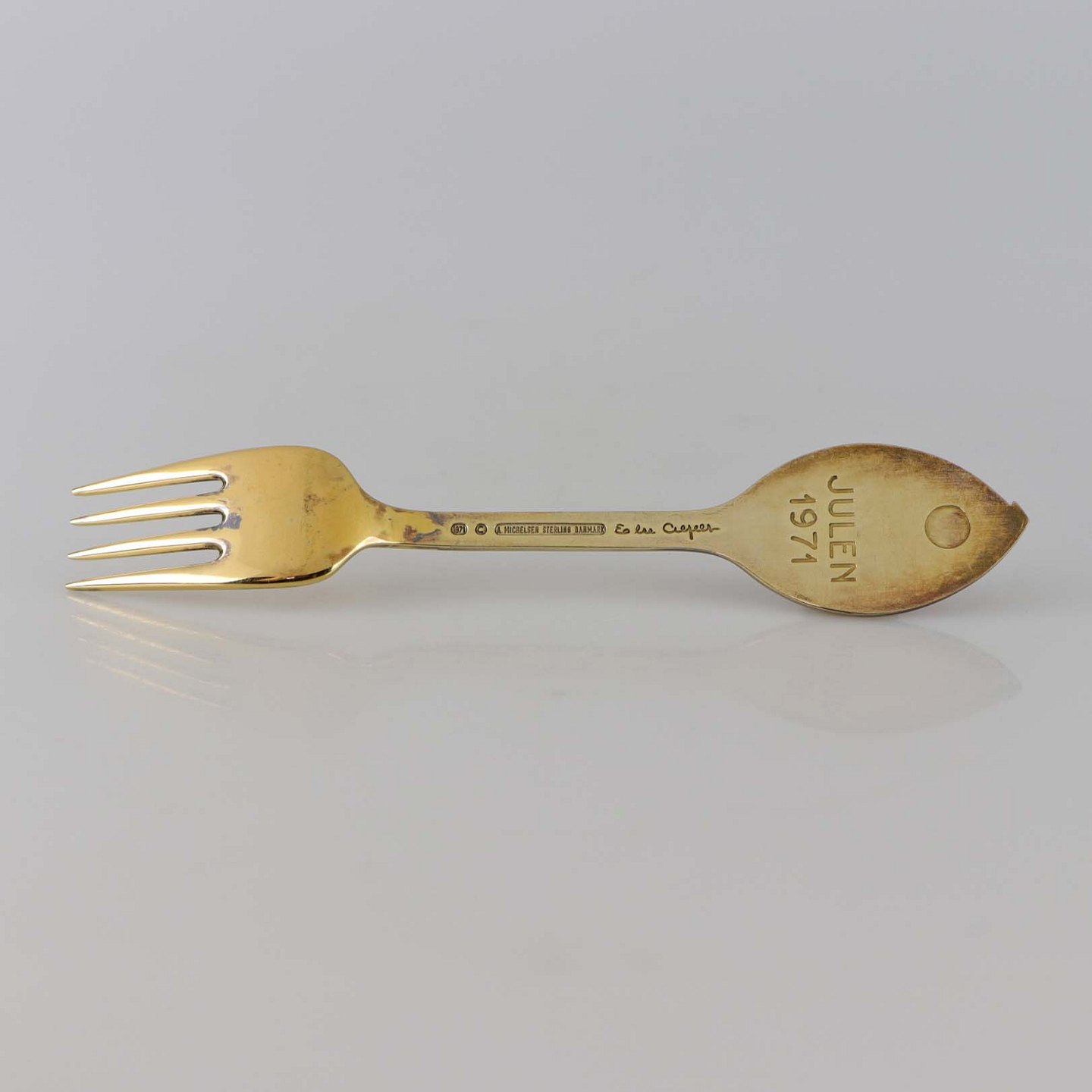 Julegaffel i forgyldt sterling sølv med indlagt emalje med teksten Jul 1971 og motiv af gyldent universDesign Else Alfelt