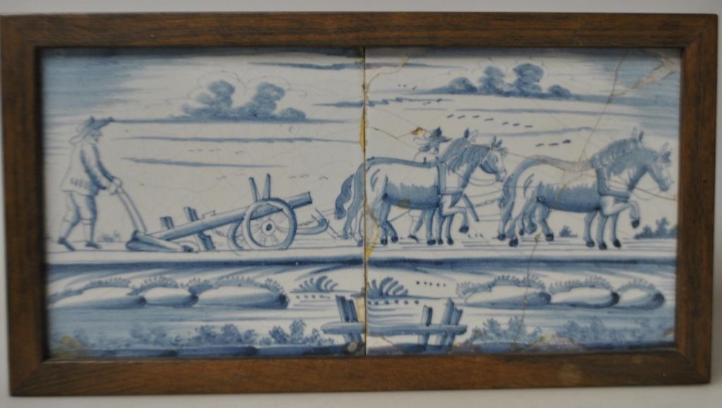 Hollandsk flise billede, 18. årh. Blå bemaling. En pløjescene med to mænd, en plov og et forspand med fire heste. 12,5 x 25 cm.Indrammet: 14,5 x 27,5 cm.