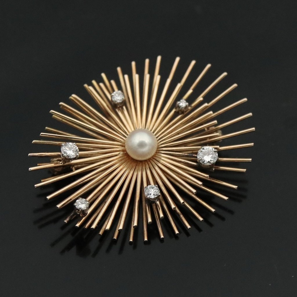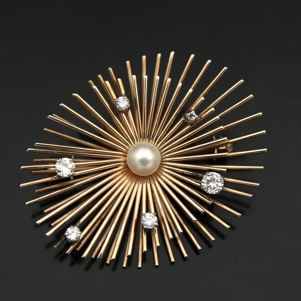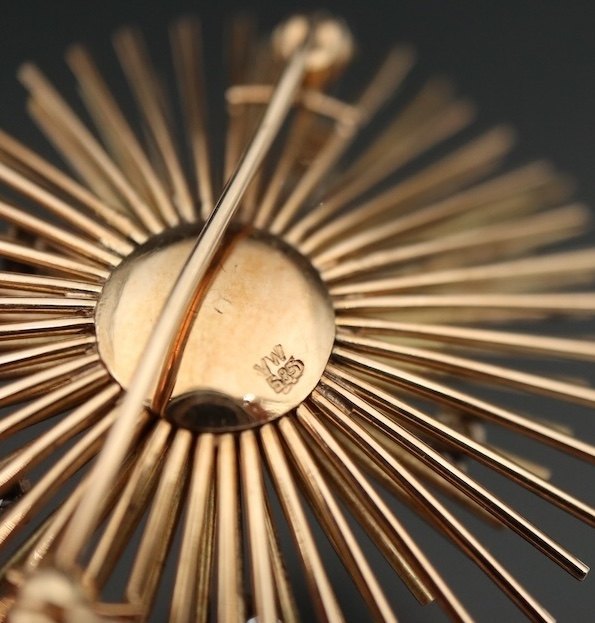 Viggo Wollny. 14k Gold Brooch with Diamonds. 13,4g.Six brillant Cut Diamonds. Largest Diamond of 0.23 ct.