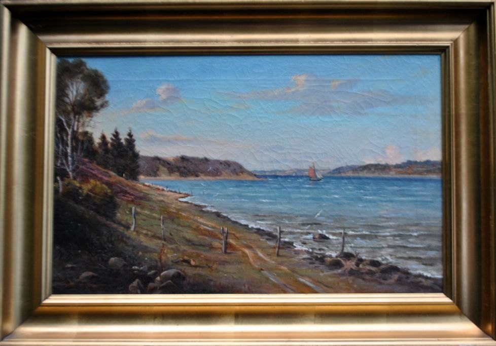 Aabrink, Axel Conrad Pedersen (1887 - 1965) Danmark: Hobro fra øst udover Mariager Fjord. Olie på lærred. Signeret. H: 36,5 cm. B: 50 cm.Indrammet: H: 48,5 cm. B: 60 cm.