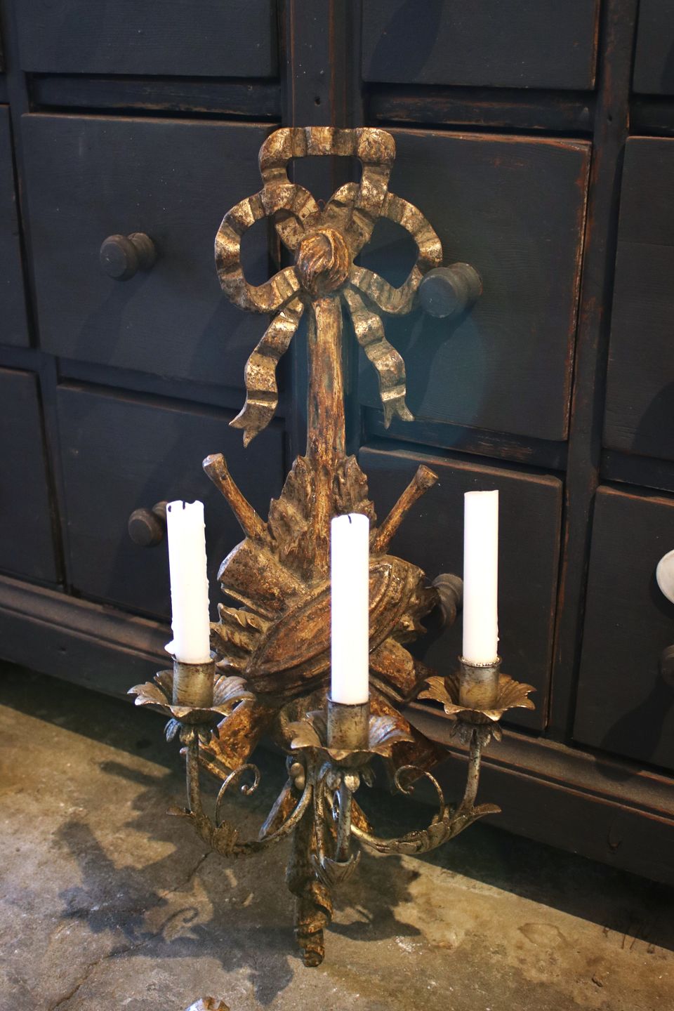 We offer a wide selection of old furniture with character, prism chandeliers and French church candlesticks.