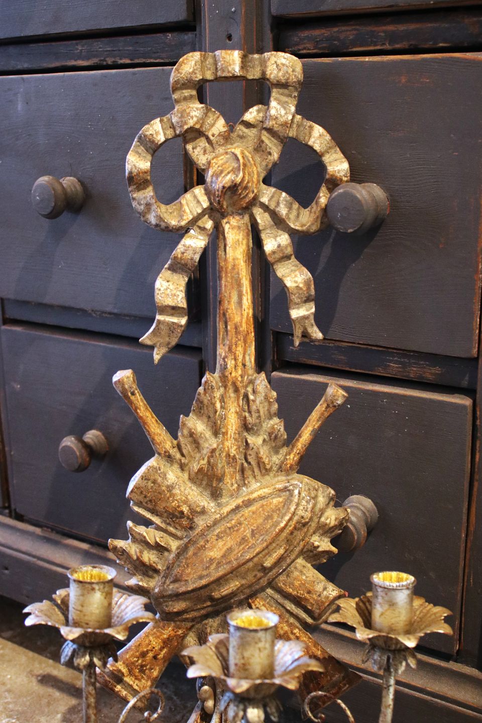 A pair of antique wall candlesticks in carved wood with old silver paint and each with 3 candle holders in metal.The wall candlesticks have a really nice patina and measure: