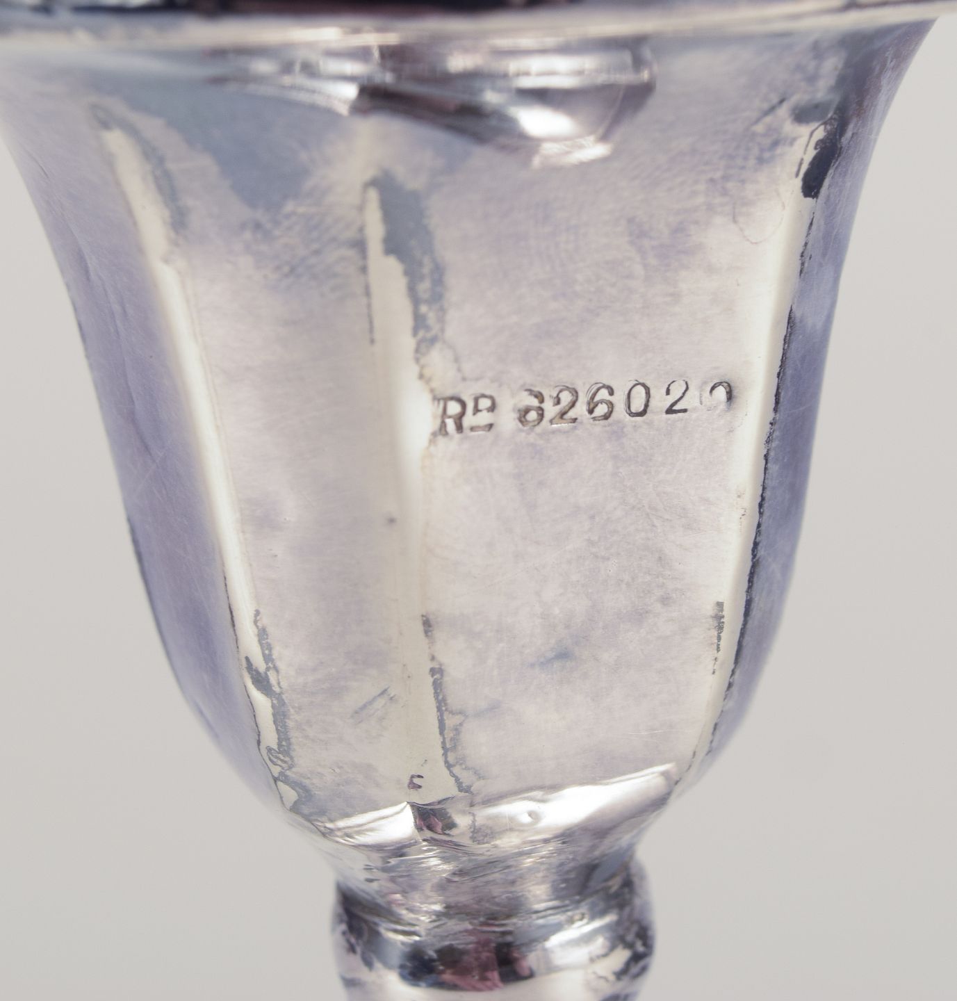 A.J. Pepper & Co. Ltd.Pair of "Hurricanes" candlesticks in silver and violet glass.