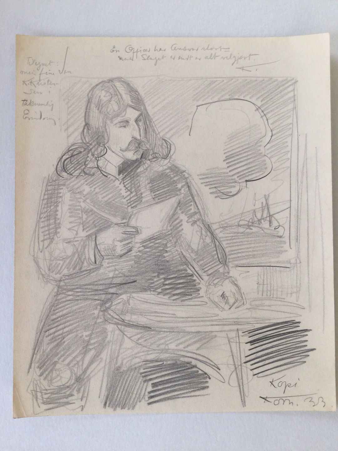 Tegning af Hans Jørgen Korn - Portræt af officer i interiør 1933.