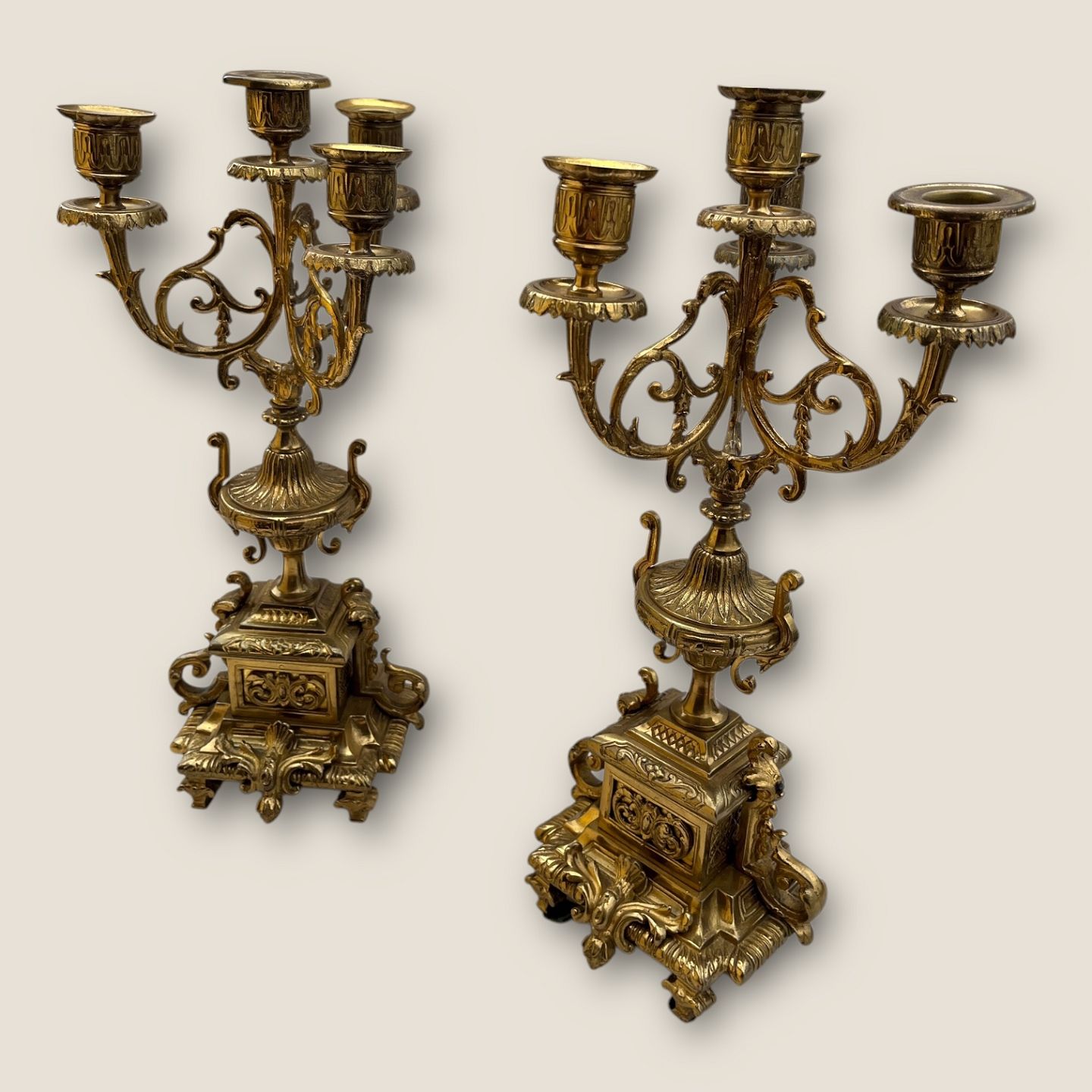Candlestick set, Brass, 4-armed, 12.5cm wide, 35cm high *Nice patinated condition*Stock: 1